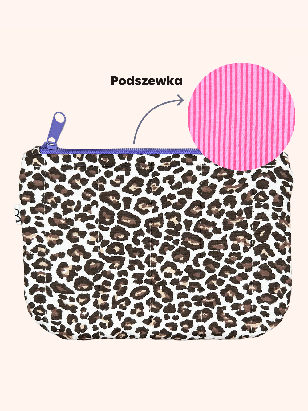 Bawełniana kosmetyczka saszetka w panterkę to praktyczne połączenie stylu i funkcjonalności. Miękka, pikowana i lekka – ta płaska kosmetyczka pomieści wszystko, czego potrzebujesz na co dzień lub w podróży. Uszyta z bawełnianego materiału, z unikalną podszewką w paski i zamkiem w kolorze fioletowym. Przyjemna w dotyku i urocza sprawdzi się również jako kosmetyczka na prezent.