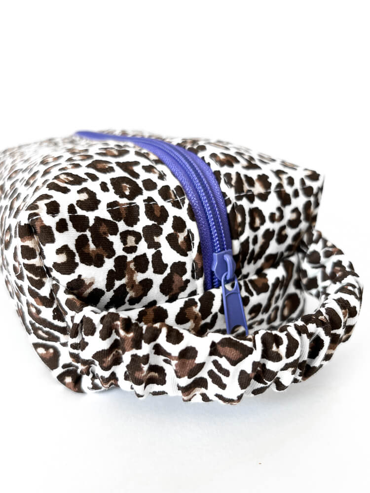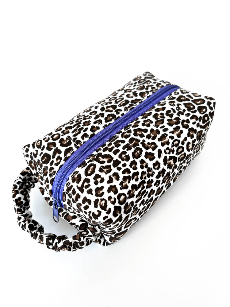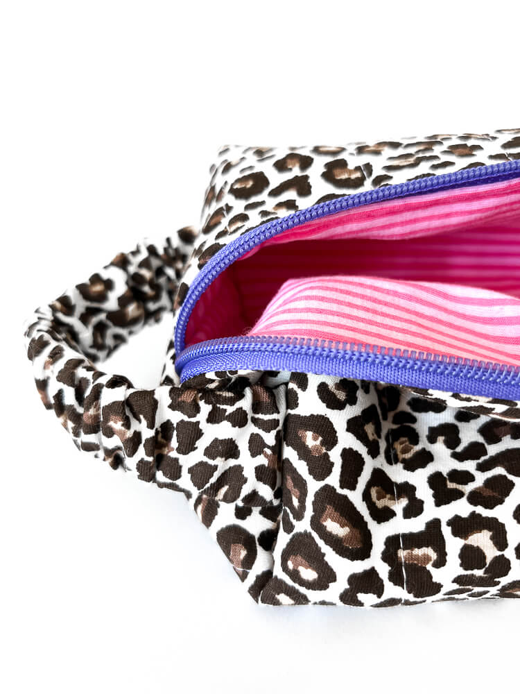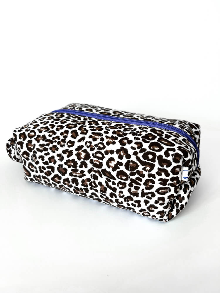 Miękka kosmetyczka w panterkę w kształcie piórnika uszyta jest z bawełnianego materiału. Dopasowujący się do dłoni uchwyt i fioletowy suwak sprawiają, że kosmetyczka jest wygodna w codziennym użytkowaniu. Modne pikowanie w pasy i kontrastująca bawełniana podszewka w różowe paski sprawiają, że kosmetyczka jest unikatowa i wyjątkowa. W sam raz na prezent dla osoby, która ma wszystko.