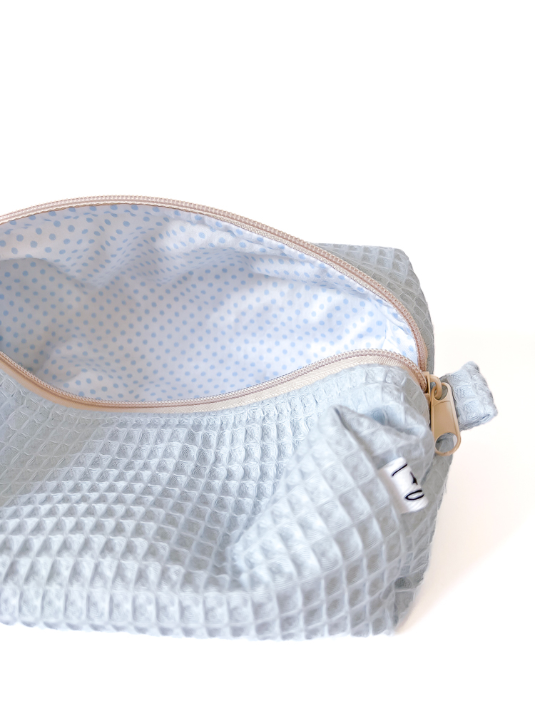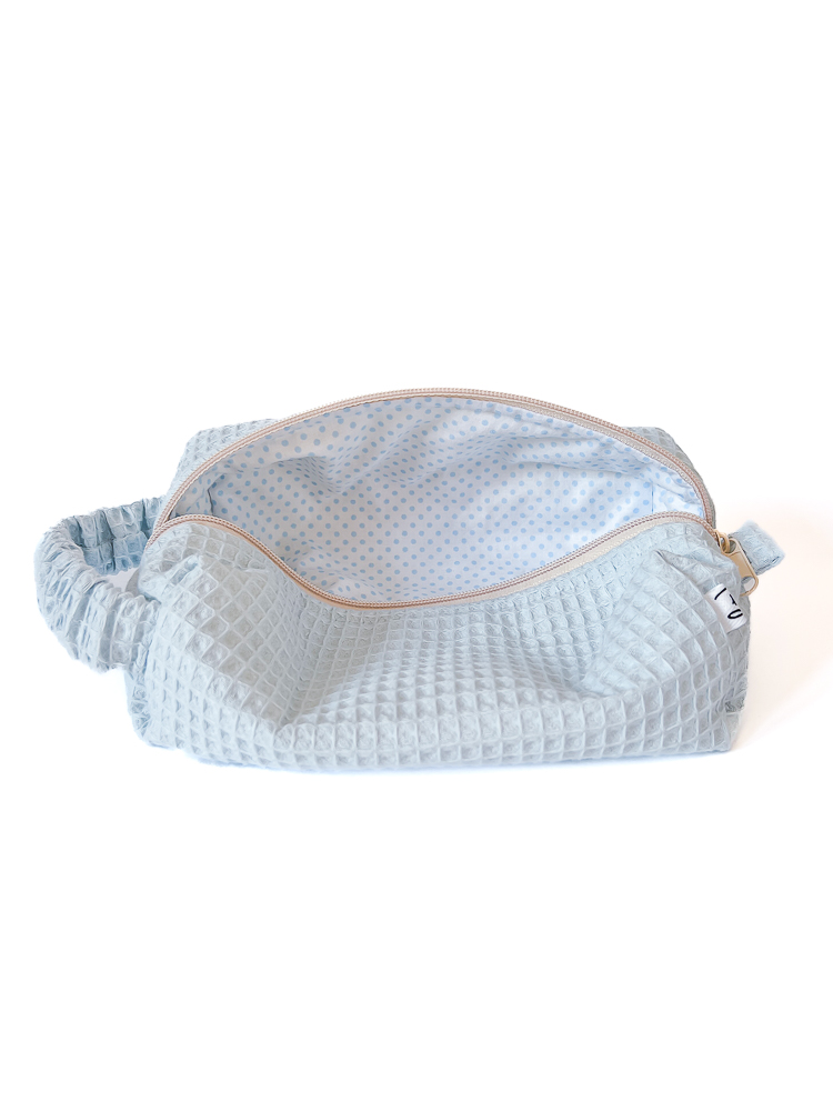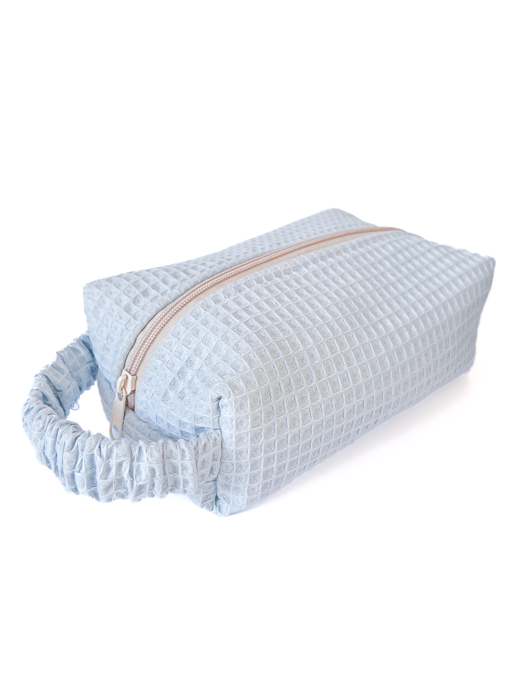 Waflowa kosmetyczka podróżna w kształcie piórnika / pudełka w jasnoniebieskim kolorze z bawełnianą podszewką w niebieskie kropki. Kosmetyczka jest jednokomorowa, ma wygodny uchwyt dopasowujący się do dłoni i zamek w kolorze szampańskim. Bawełniane wypełnienie sprawia, że kosmetyczka trzyma formę i dodatkowo chroni zawartość.