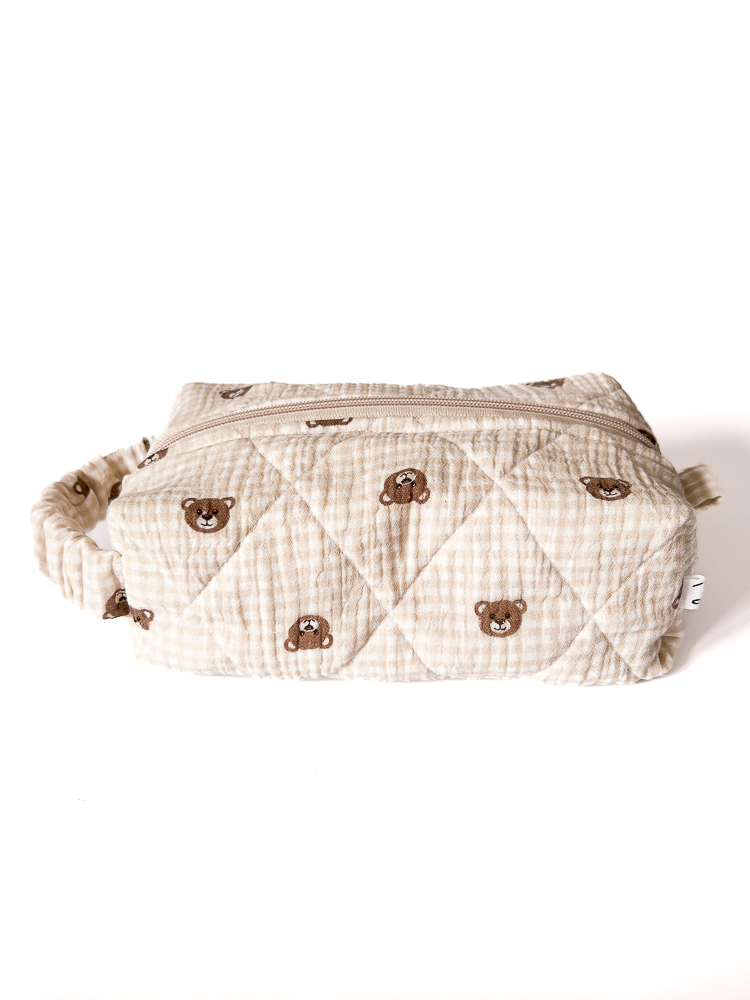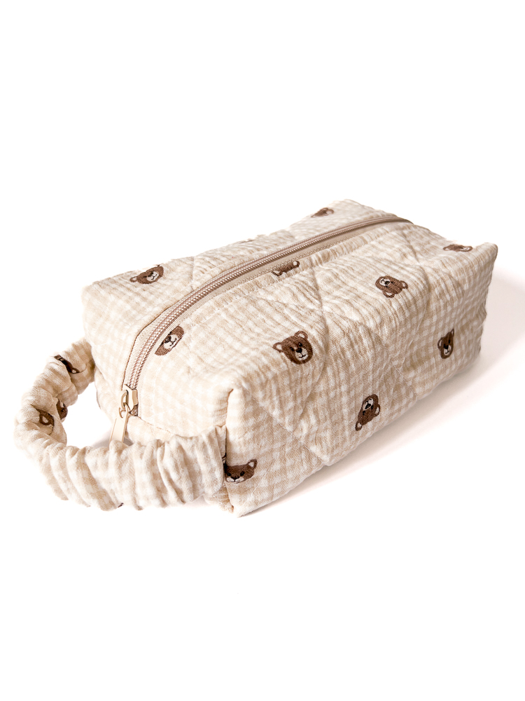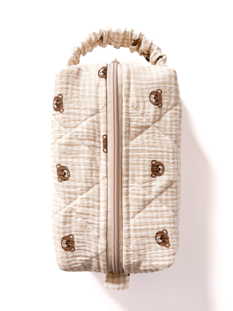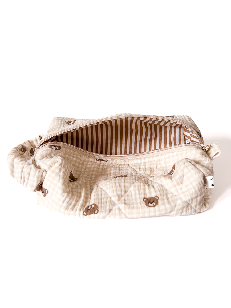 Muślinowa kosmetyczka podróżna w kształcie piórnika / pudełka w brązowe misie z bawełnianą podszewką w kakaowe paski. Kosmetyczka jest jednokomorowa, ma wygodny uchwyt dopasowujący się do dłoni i zamek w kolorze szampańskim. Bawełniane wypełnienie trzyma formę i dodatkowo chroni zawartość kosmetyczki.