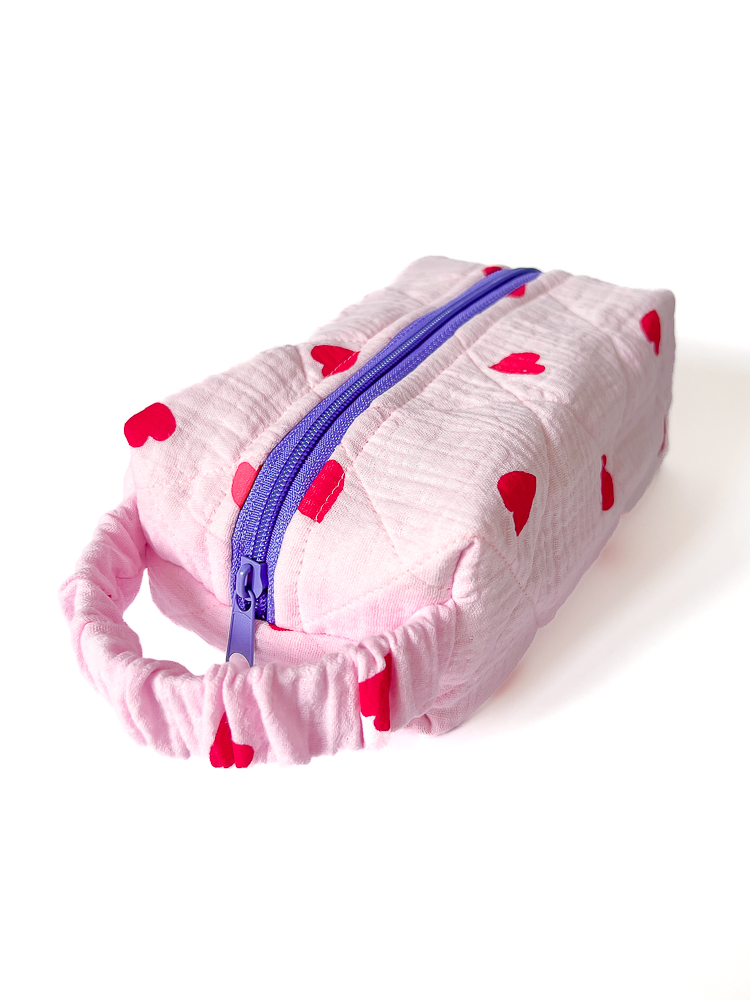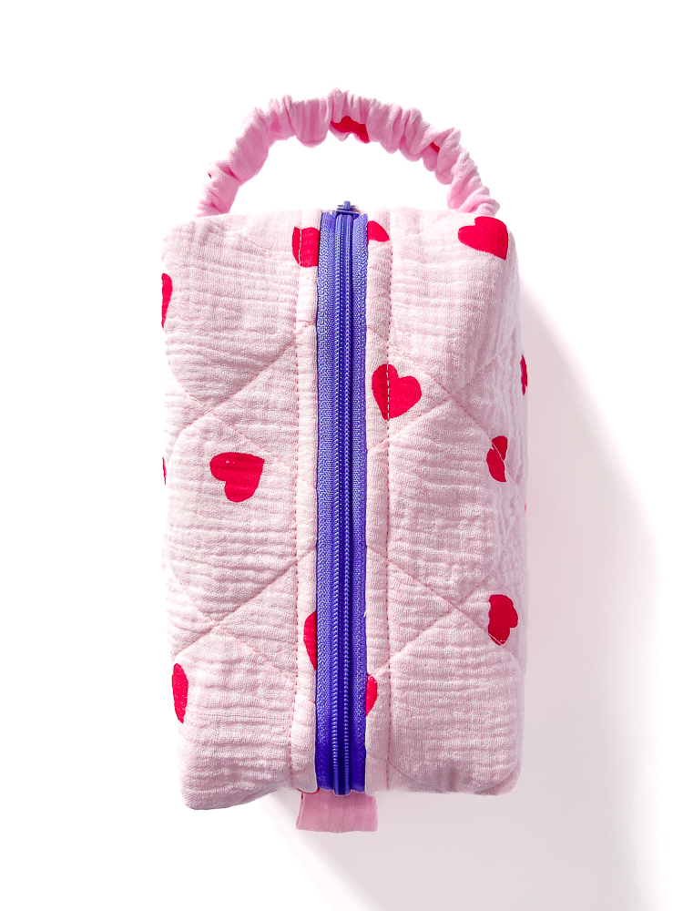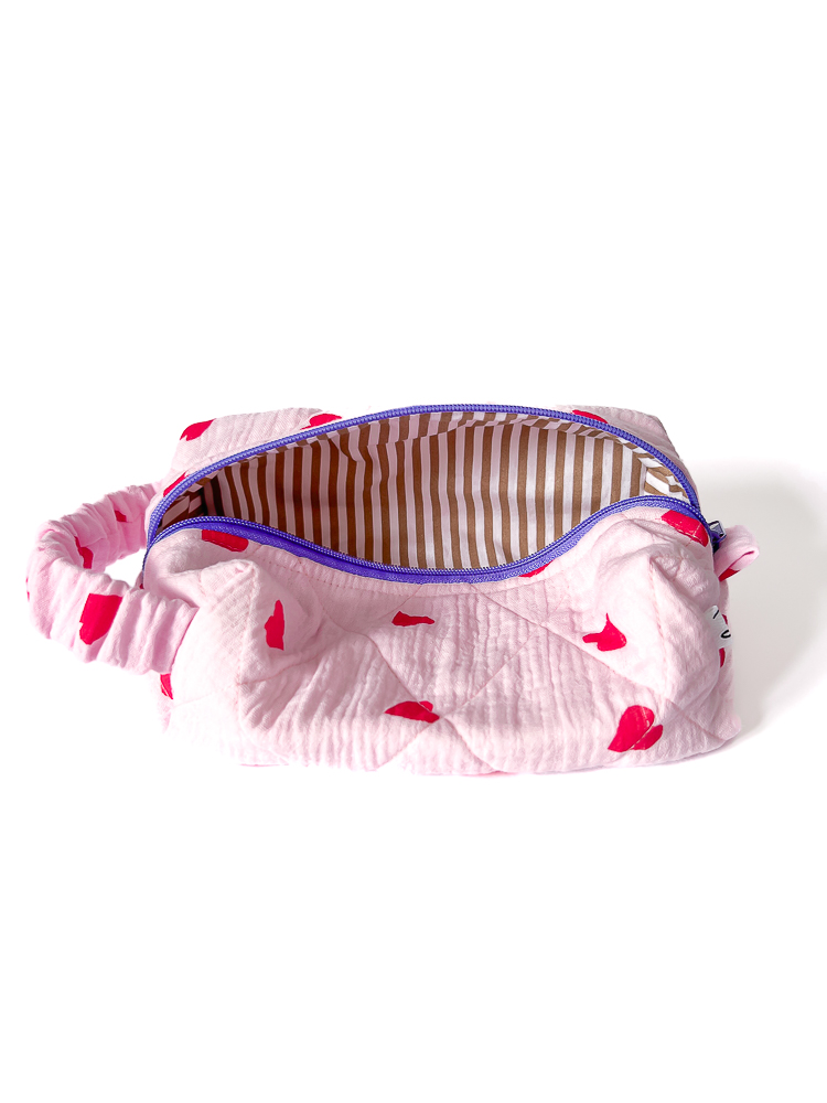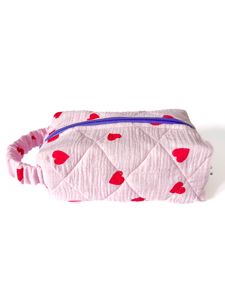 Muślinowa kosmetyczka podróżna w kształcie piórnika / pudełka w serca z bawełnianą podszewką w kakaowe paski. Kosmetyczka jest jednokomorowa, ma wygodny uchwyt dopasowujący się do dłoni i zamek w kolorze fioletowym. Bawełniane wypełnienie trzyma formę i dodatkowo chroni zawartość kosmetyczki.