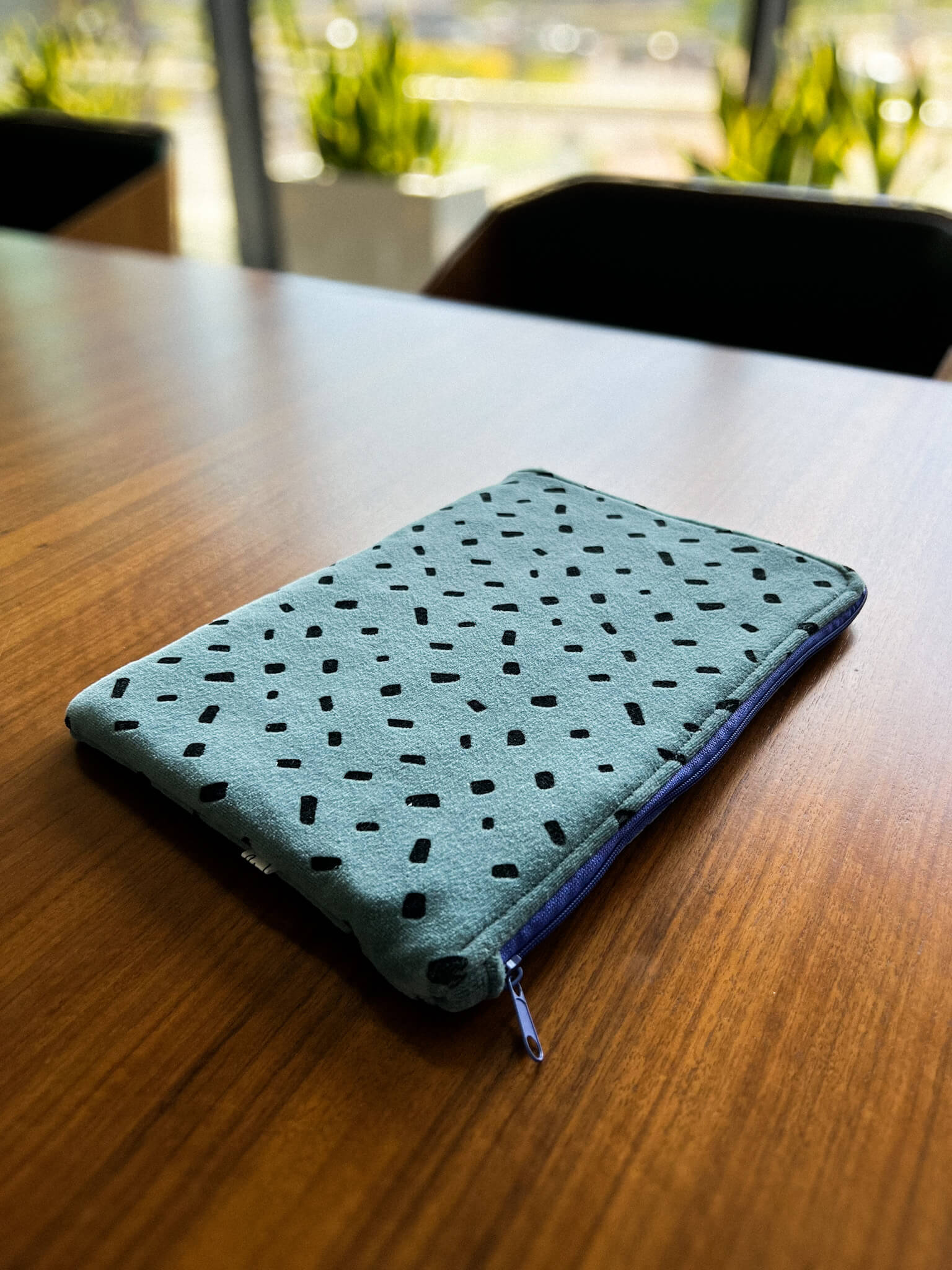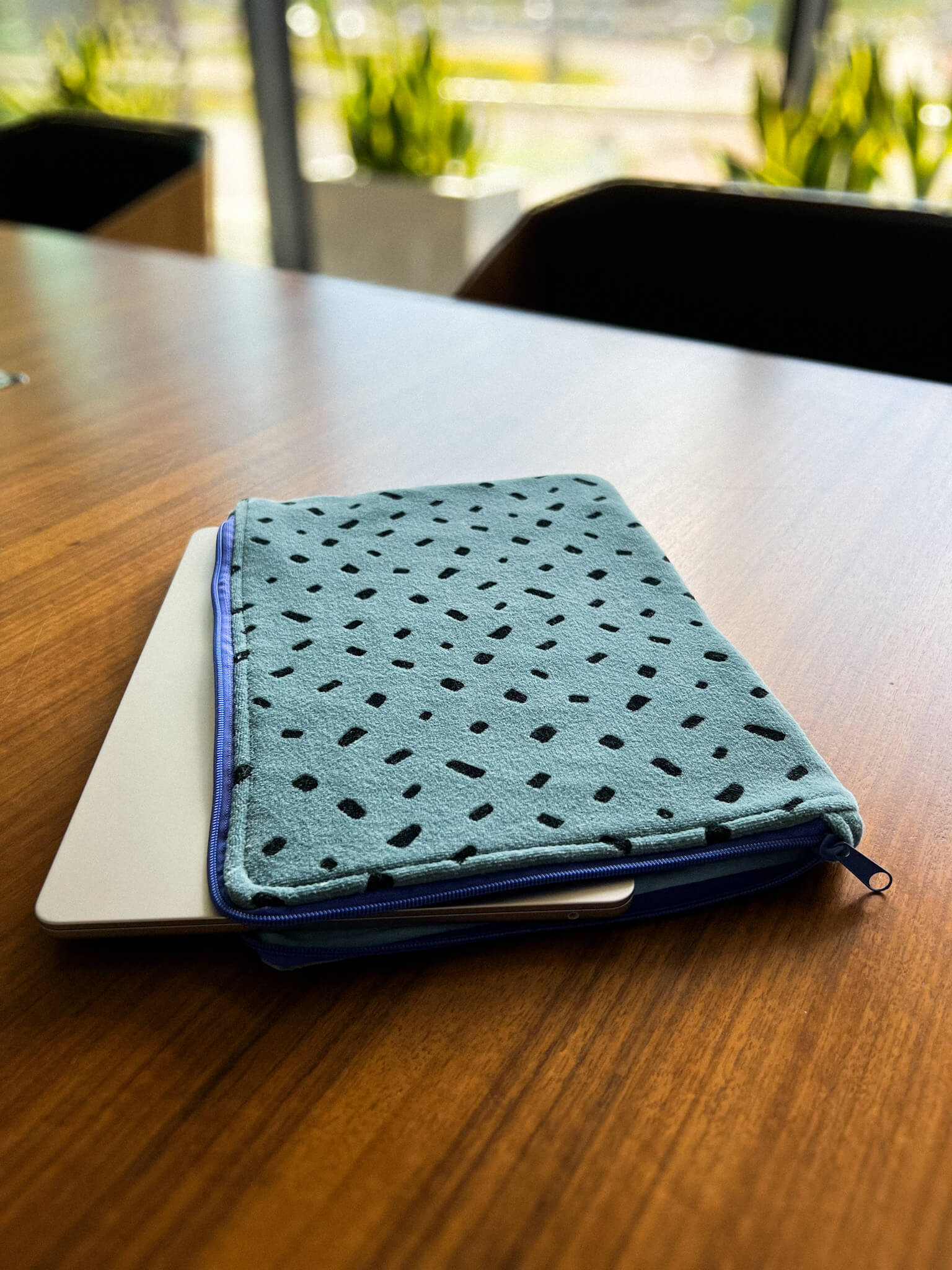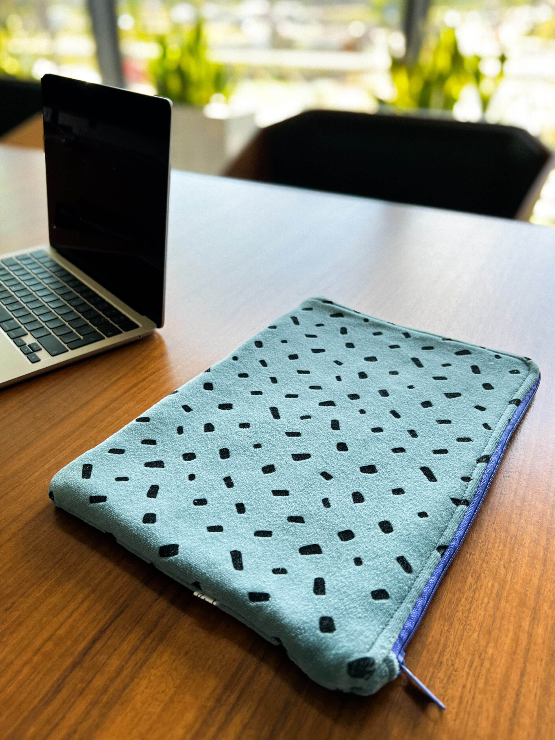 Niebieskie etui na laptopa z zamkiem uszyte ręcznie z weluru bawełnianego ze wzorem w czarne plamki. Welurowe etui ochroni laptopa przed zarysowaniami, kurzem i przypadkowymi uszkodzeniami.